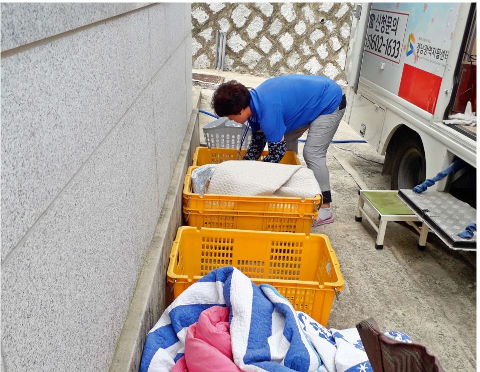 남해군 상주면 소량마을, ‘찾아가는 빨래방’소량 마을회관 앞에서 홀로어르신 10가구 이불 20채 세탁정민권 기자 / |