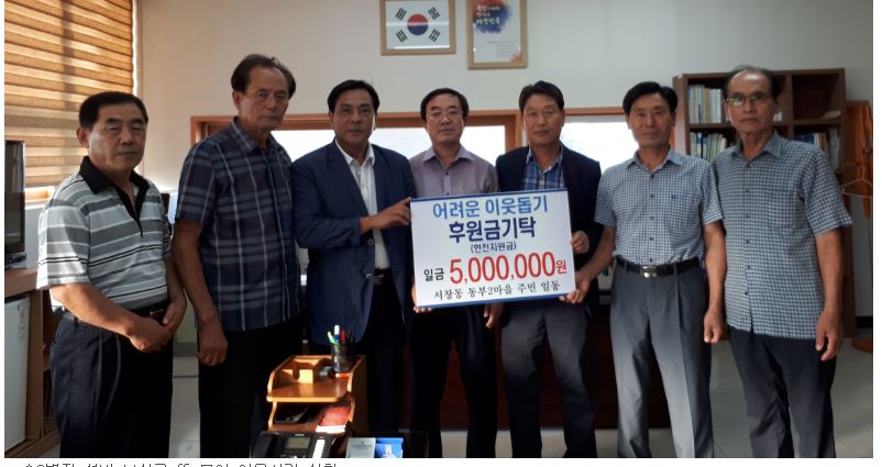 양산시 서창동 동부2마을 주민들이 8월 29일 서창동행정복지센터에서 우리 지역의 돌봄이웃을 위해 써달라며 송?변전 설비 관련 지원 보상금 5백만원을 후원금으로 기탁하였다. ‘송?변전설비 주변지역의 보상 및 지원에 관한 법률’이 공포된 이후 한전으로부터 지원되는 보상금을 동부2마을 주민들은 모두가 만족할 수 있는 공동사업을 찾기 위해 여러차례 마을회의를 거쳤으며, 마을주민 모두가 나눔을 통한 이웃사랑 실천을 바라는 마음에서 서창동지역사회보장협의체에 후원금을 기탁하자는데 의견을 함께했다.