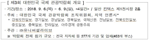 강원도, 대한민국 국제 관광박람회「최우수상」수상❶ 2018.9.6.(목) ~ 9.(일), 일산 킨텍스 제1전시장에서 개최 ❷ 전국 지자체 등 277개 기관 및 업체, 총 453개 부스 참가 ❸ 강원도 및 13개 시·군* 공동 참가 ※ 춘천, 원주, 동해, 태백, 속초, 삼척, 홍천, 횡성, 영월, 철원, 화천, 양구, 고성정유근 기자 / |