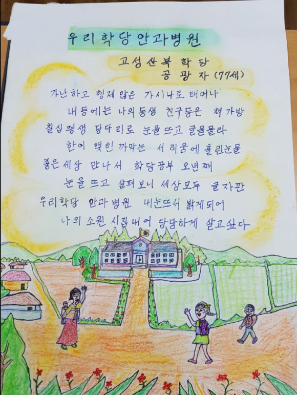 고성군은 오는 16일부터 25일까지 10일간 고성박물관에서 성인문해 시화 작품 전시회가 개최된다고 밝혔다. ‘세상을 읽고 나를 쓰다’라는 주제로 열리는 이번 전시회는 찾아가는 성인문해교육 ‘고성학당’ 학습자들의 학습 성과를 격려하고 성인 문해교육의 중요성을 알리기 위해 마련됐다. 전시회에는 학습자들이 성인문해교육을 통해 익힌 한글과 그림으로 표현한 시화 작품 115점이 전시되며 오는 30일부터 31일까지 이틀간은 군청 1층 로비에서 특별 전시회를 개최할 계획이다. 한 학습자는 “어려서부터 배우지 못한 것이 한이었는데 지금은 학당을 통해서 무엇이든지 많이 배우고 싶다”며 “한 자 한 자 한글을 깨칠 때 마다 인생의 즐거움도 함께 느끼고 있다” 고 시화전 참가 소감을 밝혔다.