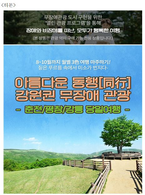 이번 상품은 「강원도 무장애 관광도시 조성사업」의 일환으로 추진하는 것으로, 지난 8월에는 춘천의 남이섬과 애니메이션 박물관, 9월에는 평창의 삼양목장과 월정사 코스로 운영하였고 10월부터는 강릉의 정동진, 아쿠아리움, 안목해변 코스를 운영·판매하고 있으며 10월 강릉 상품은 구매자들의 반응이 좋아 11월까지 연장할 예정이다. 12월에는 식도락 여행의 성지인 속초의 대포항, 워터피아 코스를 운영할 예정이여서 연말에는 최종 상품 이용객이 1,000여명을 돌파할 것으로 예상된다.