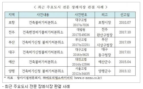 그러나 최근에는 주요 대도시 전문 장례식장 설치에 대한 행정소송에서 ‘행정기관이 공공복리를 내세워 법률적 근거없이 장례식장 건축허가 신청을 반려 또는 취소하는 것은 위법이다’라는 다수의 판결이 잇따라 내려지고 있다. 따라서 앞으로는 지역주민들의 반대 민원이 있다고 해서 시·군·구청 등 행정기관이 전문 장례식장 건축허가 신청을 법률적 근거 없이 반려 또는 취소해 민간 사업자에게 재산상의 피해를 주는 행정행위에 제동이 걸릴 것으로 예상된다.