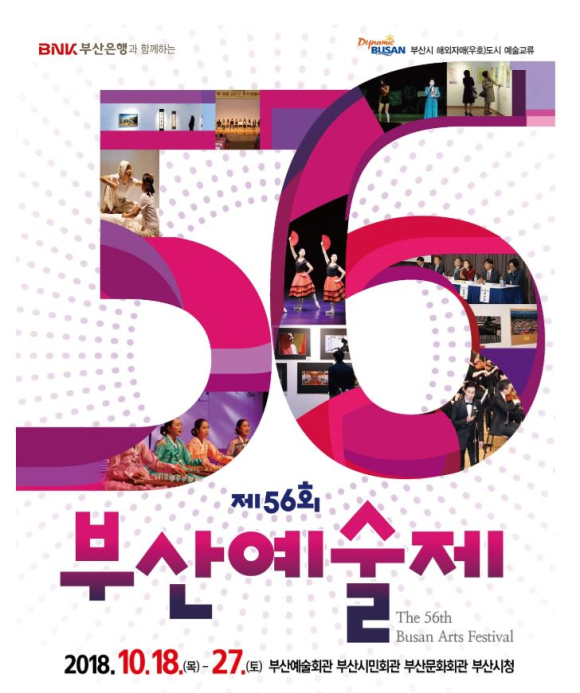 부산시(시장 오거돈)는 10월 18일부터 10월 27일까지 10일 동안 부산예술회관, 부산문화회관, 부산시민회관, 부산시청 등에서「제56회 부산예술제」를 개최한다고 밝혔다.