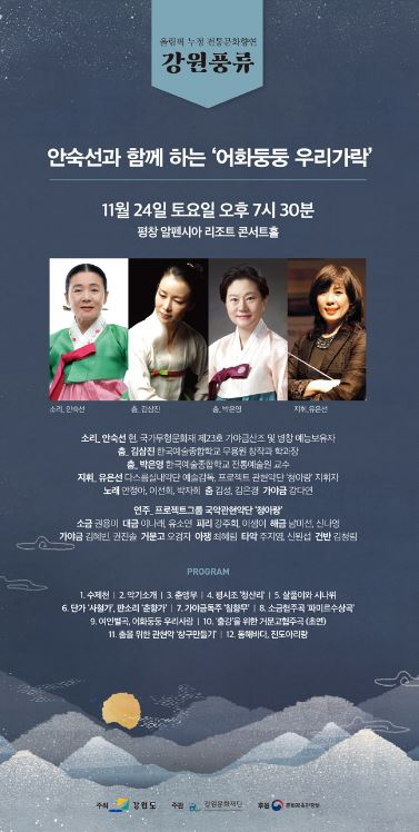 <올림픽 누정 전통문화향연 ‘강원풍류’>의 11번째 공연이 오는 11월 24일 토요일 오후 7시30분에 알펜시아 리조트 콘서트홀에서 펼쳐진다. 전통음악부터 창작음악까지, 국악에 대해 가장 쉽게 이해할 수 있는 공연이 개최될 예정이다. 지난 5월부터 평창에서 펼쳐진 <강원풍류> 의 11번째 공연 ‘안숙선과 함께 하는 어화둥둥 우리가락’에서는 안숙선 명창이 출연하여 판소리에 대한 이해를 높일 수 있는 ‘판소리 해설’과 ‘추임새 가르치기’등 국악에 대해 직접 듣고, 보고, 감상하고 체험할 수 있는 공연을 만날 수 있다. 뿐만 아니라 궁중음악과 민속음악, 창작음악, 궁중무용과 민속무용, 창작무용 등 장르별로 비교해서 감상할 수 있는 공연이다.