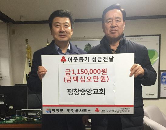 ....................................【미 담 사 례】.................................... □ 평창중앙교회 이웃돕기성금 기탁 ○ 어제(12.4.) 평창중앙교회(목사 조장환)에서 평창읍사무소를 방문하여 연말연시 어려운 이웃에게 사용해 달라며, 성금1,150,000원을 기탁함.