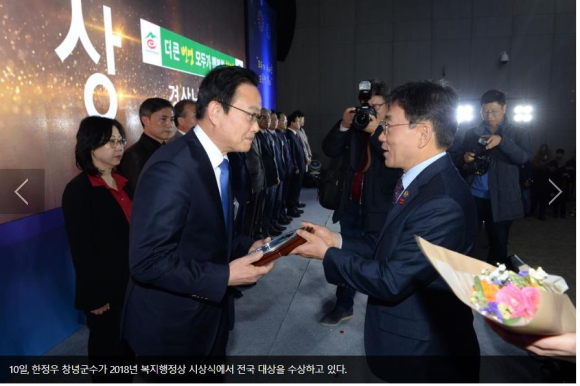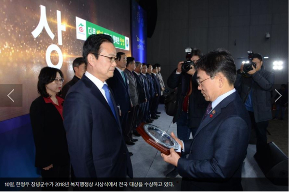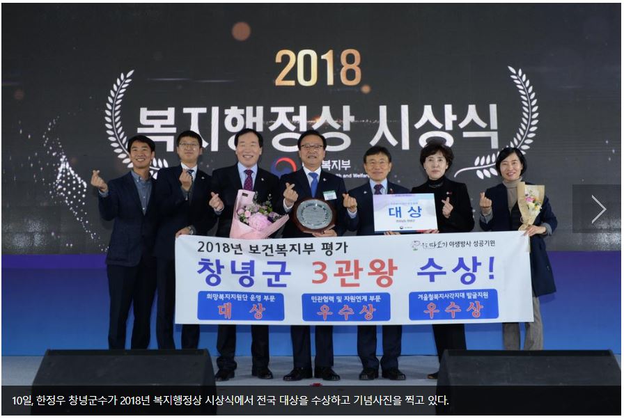 창녕군(군수 한정우)은 10일, 세종컨벤션센터에서 열린 보건복지부 주관 2018년 복지행정상 시상식에서 전국 대상을 수상했다고 밝혔다.