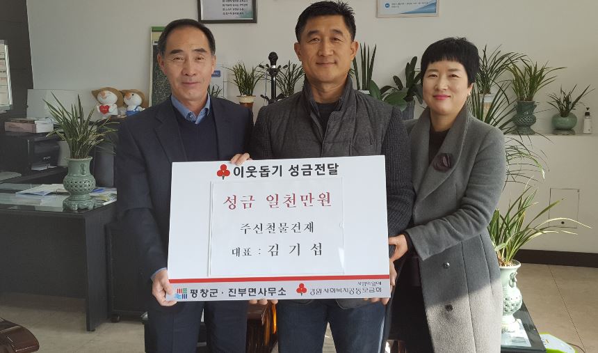 평창군 진부면 주신철물건재상사 김기섭 대표, 불우이웃돕기 성금 1천만원 기부정민권 기자 / |