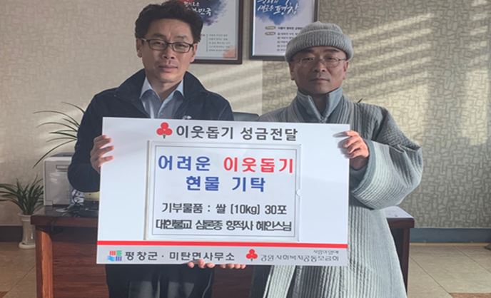 | ○ 지난(12.28.) 미탄면 소재 청산건설㈜(대표 안완선)에서 희망 2019나눔캠페인 성금 50만원을 미탄면사무소에 기탁함. ○ 지난(12.27.) 방림 4리 부녀회에서 희망2019 나눔캠페인 성금 20만원을 방림면사무소에 기탁함. ○ 지난(12.27.) 청산건설(대표 안완선)에서 희망2019 나눔캠페인 성금 50만원을 방림면사무소에 기탁함. ○ 지난(12.27.) 강산측량(대표 지호동)에서 희망2019 나눔캠페인 성금 30만원을 방림면사무소에 기탁함. ○ 지난(12.28.) 대화면 소재 강산측량(대표 지호동)에서는 「희망2019 나눔캠페인 평창군 연합모금」에 동참하여 성금 30만원을 대화면사무소에 기탁함. ○ 지난(12.28.) 대화면 소재 한성토건(대표 이영민)에서 「희망2019 나눔캠페인 평창군 연합모금」에 동참하여 성금 30만원을 대화면사무소에 기탁함. ○ 지난(12.28.) 대화면체육회(회장 정하걸)에서「희망2019 나눔캠페인 평창군 연합모금」에 동참하여 성금 30만원을 대화면사무소에 기탁함. ○ 지난(12.28.) 대화면 소재 대화종합가구(대표 이흥기)에서는「희망2019 나눔캠페인 평창군 연합모금」에 동참하여 성금 30만원을 대화면 사무소에 기탁함. ○ 지난(12.28.) 대화면 소재 다온건설(대표 김정기)에서「희망2019 나눔캠페인 평창군 연합모금」에 동참하여 성금 50만원을 대화면사무소에 기탁함. ○ 지난(12.28.) 메밀꽃향기(대표 홍순권)에서 ‘2019 희망나눔 캠페인’ 모금활동에 동참하기 위하여 성금 50만원을 봉평면사무소에 기탁함. ○ 지난(12.28.) 미광전기(대표 박상균)에서 ‘2019 희망나눔 캠페인’ 모금활동에 동참하기 위하여 성금 50만원을 봉평면사무소에 기탁함. ○ 지난(12.28) 청송창호(대표 최경순)는 희망 2019 나눔캠페인모금활동에 참여하면서 성금 30만원을 진부면사무소에 기탁함 ○ 지난(12.28) 동서광고(대표 권현숙)는 희망 2019 나눔캠페인모금 활동에 참여하면서 성금 30만원을 진부면사무소에 기탁함 ○ 지난(12.28) 진부중기연합(대표 황정구)는 희망 2019 나눔캠페인모금활동에 참여하면서 성금 100만원을 진부면사무소에 기탁함. ○ 지난(12.28) 두일2리(이장 함정주)는 희망 2019 나눔캠페인모금활동에 참여하면서 성금 20만원을 진부면사무소에 기탁함. ○ 지난(12.27) 횡계10리(이장 함영만) 주민일동은 희망2019 나눔캠페인 성금으로 12만원을 대관령면사무소에 기탁함. ○ 지난(12.27) 맷돌순두부(사장 이종호)에서 희망2019 나눔캠페인 성금으로 20만원을 대관령면사무소에 기탁함. ○ 지난(12.27) 유천2리 부녀회장 김명혜님께서 희망2019 나눔캠페인 성금으로 10만원을 대관령면사무소에 기탁함. ○ 지난(12.27) 공군 제8786부대에서 희망2019 나눔캠페인 성금으로 84,000원을 대관령면사무소에 기탁함. □ 봉평 해병전우회, 바르게살기협의회 어려운 가정 성품전달 ○ 지난 12월 29일(토) 봉평면 해병전우회, 바르게 살기협회는 관내 저소득가정 2가구에 방문하여 50만원(1가구당 25만원) 상당의 물품을 전달함. |