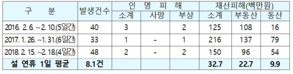 최근 3년간 설 연휴 화재사례를 살펴보면 도내에서는 총 121건, 일일평균 8.1건이 발생하여 평소 6.1건보다 높았으며, 발생장소는 주거시설이 37건으로 가장 높게 나타났다.