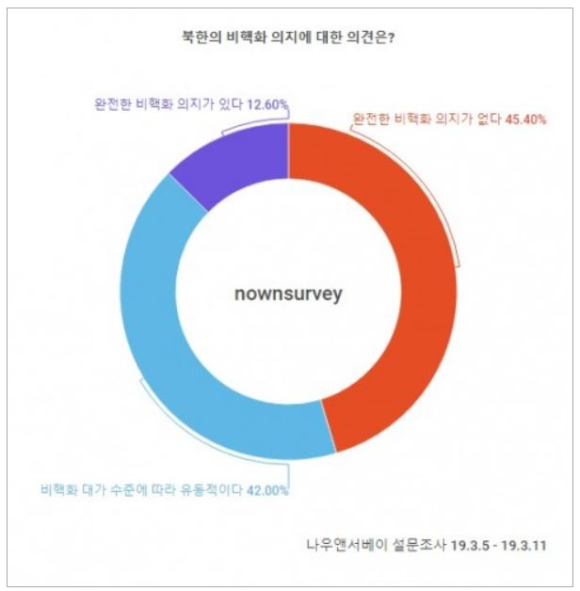 2019년 3월 15일 (뉴스와이어) -- ㈜엘림넷 나우앤서베이는 지난달 하노이 2차 북·미 정상회담이 결렬된 직후인 3월 5일부터 3월 11일까지 나우앤서베이 패널 717명을 대상으로 북한 핵개발 관련 설문조사를 실시하였다.