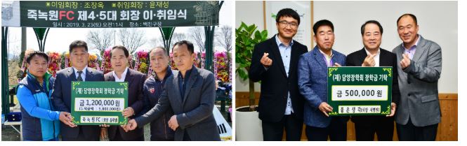 봄바람처럼 따뜻한 장학금 기탁 이어져- 죽녹원 FC 100만원, 좋은생각 50만원 기탁박권목 기자 / |