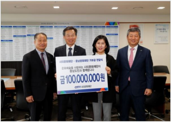 2019년 4월 12일 (뉴스와이어) -- 시티문화재단은 11일 충남도청 문화체육부지사 접견실에서 충청남도 문화발전과 지역민의 문화복지 향상을 위해 지정기부금 1억원을 전달했다고 밝혔다.