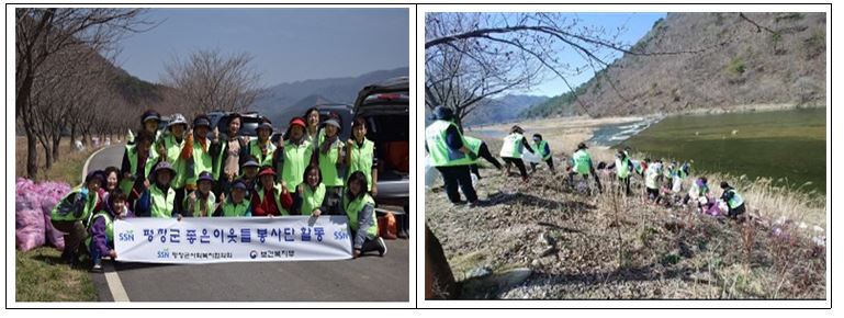 ....................................【미 담 사 례】..................................... □ 평창군 사회복지협의회 환경정화 활동 ○ 지난(4.16.) 평창군 사회복지협의회(회장 우강호) 회원 30명은 방림2리 하천변을 청소하며 환경정화 활동을 실시하였음.