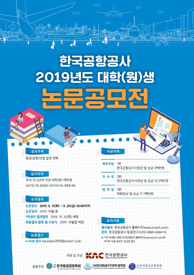 한국공항공사, 항공산업 발전 전략 주제 대학(원)생 논문공모전 개최- 국내외 2년제 이상 대학생 및 대학원생 대상, 항공산업 지속성장 전략 및 정책 대안 제시- 9월 20일까지 접수, 최우수상 한국공항공사 사장상 및 3백만원 상금 - 수상 논문집 및 항공분야 3개 전문학회 학술지 게재 김윤국 기자 / |