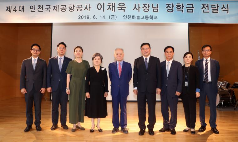 14일 오후 인천하늘고등학교 강당에서 열린 장학금 전달식에는 故 이채욱 사장 유가족, 인천공항공사 구본환 사장, 인천하늘교육재단 지용택 이사장, 인천하늘고등학교 김일형 교장, 장학생 및 학부모 대표 등 관계자 40여 명이 참석해 고인의 뜻을 기렸다.