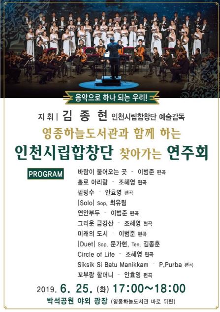 인천광역시(시장 박남춘) 미추홀도서관은 인천시립예술단이 공모한 「2019년도 상반기 찾아가는 공연(연주회)」에 선정되어 6월 25일 오후5시에 영종하늘도서관 바로 뒤편 박석공원에서 공연을 진행한다고 밝혔다.