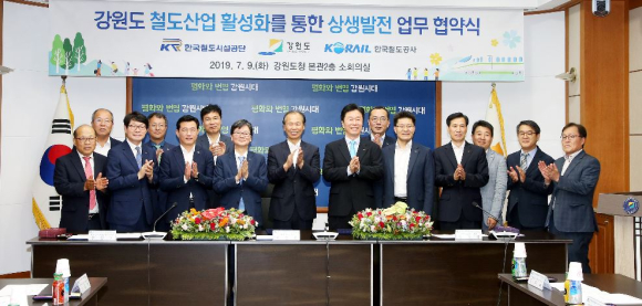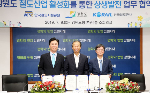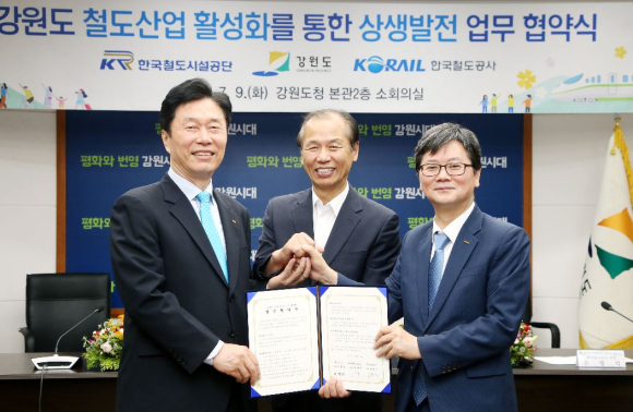 강원도(도지사 최문순)와 한국철도공사(사장 손병석, 이하 ‘공사’), 한국철도시설공단(이사장 김상균, 이하 ‘공단’)은 7. 9.(화) 11시 강원도청 본관 소회의실에서 강원도 철도산업 활성화를 통한 상생발전 업무협약(MOU)을 체결했다. 강원도는 기존 중앙선, 태백선, 영동선은 물론 2000년대 개통된 경춘선 ITX, 강릉선 KTX 등 고속화철도 시대를 맞아 철도산업의 중요성을 인식하고 체계적인 육성을 위해 노력하고 있으며,