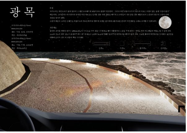 | 작품 <광목>은 해안도로가 많은 제주에 곡선 커브길 LED 등을 설치해 야간 교통사고를 줄이고, 자연경관을 유지하는 컨셉으로 공모전의 주제를 가장 잘 표현한 작품이라는 평가를 받았다.