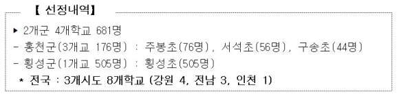 「초등학교 아침간편식 시범사업」은 청소년기 아침밥 먹기와 바른 식습관형성 및 학업집중도 향상을 위해 신규 추진하는 사업으로, 도에서는 사업신청을 위해 교육청과 협의하여 교육청, 초등학교 등 관계자를 대상으로 사업설명회(5월)와 교장단 간담회(7월) 개최 후 4개 초등학교( 홍천군 3, 횡성군 1)가 신청하여 모두 시범학교로 선정되는 성과를 이루었다.