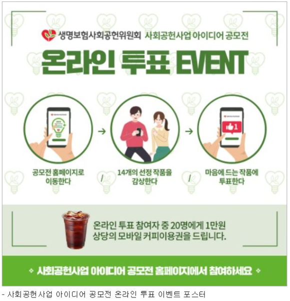 한편 2차 심사와 동시에 공모전 공식 홈페이지에서는 1차 심사를 통과한 14개 작품에 대한 온라인 투표 이벤트가 진행된다. 투표 참여 시 추첨을 통해 총 20명에게 1만원 상당의 모바일 커피 교환권을 제공한다. 이는 사회공헌사업에 대한 국민들의 관심도 및 의견을 알아보기 위해 마련된 소통의 장으로 누구나 쉽게 참여할 수 있다.