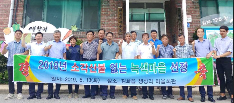 강원도는 지난 8월 13일 “2019년 소각산불 없는 녹색마을”로 선정된 철원군 김화읍 생창리마을회관에서 한금석 강원도의회 의장, 이덕하 강원도 녹색국장, 이현종 철원군수, 김남국 생창리마을이장 및 주민 등이 참석한 가운데 우수마을 현판식을 갖고 시상금으로 강원상품권 1백만원을 전수 하였다고 밝혔다.