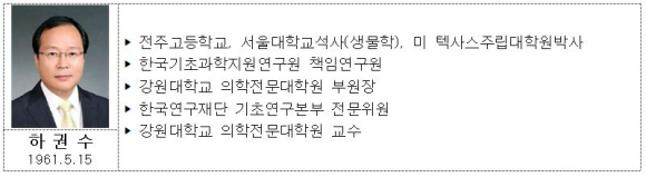 하 신임 원장은 전주고, 서울대학교 및 텍사스주립대학원 박사과정을 거쳐 한국기초과학지원연구원 책임연구원, 한국연구재단 기초연구본부 전문위원을 역임하고, 2002년부터 강원대학교 의학전문대학원 교수로 재직하고 있다.