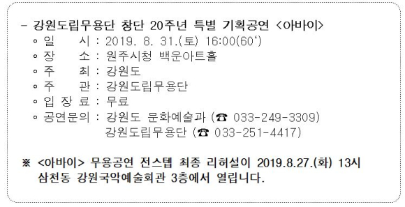 강원도립무용단 창단 20주년 특별공연 <아바이> 새로운 장르의 무용콘서트로 만나다2019. 8. 31.(토) 16:00, 원주 백운아트홀정유근 기자 / |