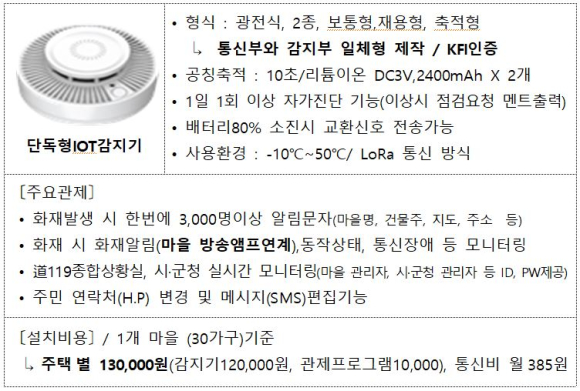 강원도 소방본부는 최근 4년간 화재다발 지역(마을), 소방관서 원거리 지역, 독거노인 등 소외계층 마을 중 시범사업을 희망하는 4개 마을(원주 서곡4리, 강릉 삼산2리, 횡성 안흥4리, 평창 병내리) 140가구 159명을 선정하였으며, 9월중 마을별 사업설명회를 거쳐 10월중 사업을 마무리할 방침이다.(*무료설치) 김충식 소방본부장은“시범사업후 효과측정을 통해 도 안전총괄과와 협업하여 연차적으로 확대 검토해 나갈 방침”이라고 말하고, IOT화재알리미를 통하여 시간・공간 추월 가족 안전확인은 물론 농촌 고령화 등 취약지역 화재안전망 구축에 효과가 있을 것으로 기대한다고 밝혔다. 끝. ※「마을 IOT화재알리미 시스템」 개요