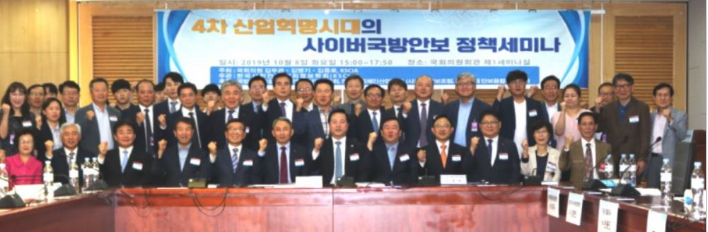 2019년 10월 10일 (뉴스와이어) -- 한국사회안전 범죄정보학회(이하 KSCIA)는 국회의원 김두관·김병기·김중로 의원 등과 공동 주최로 ‘4차 산업혁명시대 사이버국방안보 정책 세미나’를 국회 의원회관에서 권혁진(국방부 정보화기획관), 모종화(방진회 상근부회장), 최준택(안양대 석좌교수), 조광제(서울미디어대학원대학 이사장), 박신규(국방안보포럼 공동대표), 연삼흠(한국블록체인산업협회장), 강태원(ADD 부소장), 송승엽(한반도미래연구원 원장), 김정호(국방안보포럼 상임위원장), 광운대 학생 둥 150여명의 예비역장성 및 군인, 방위산업 관계자, 학자 등 산·학·연 전문가들이 다수 참석한 가운데 성황리에 개최하였다.