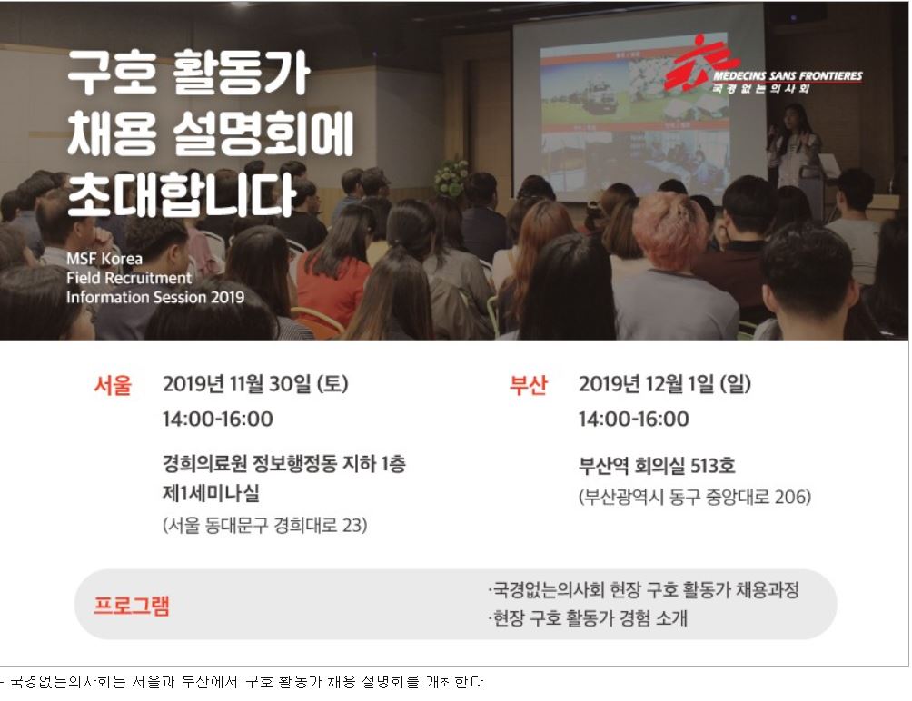 | 서울 채용 설명회는 11월 30일 동대문구 경희의료원 정보행정동 제1세미나실에서 2시에 시작하며, 부산에서는 12월 1일 동구 부산역 회의실 315호에서 2시에 개최될 예정이다. 프로그램 일부는 영어로 진행되며 참가비는 무료다. 등록은 국경없는의사회 홈페이지(https://msf.or.kr/info-sessions)에서 할 수 있다.
