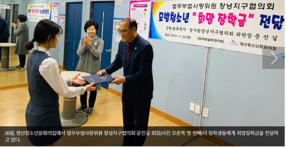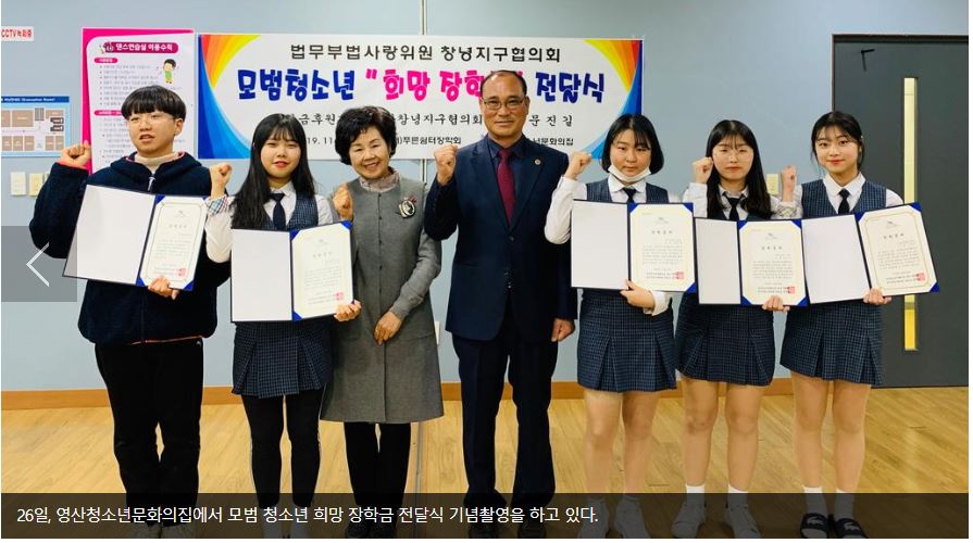 법무부법사랑위원 창녕지구협의회 문진길 회장 영산청소년문화의집 모범 청소년 희망 장학금 전달정유근 기자 / |