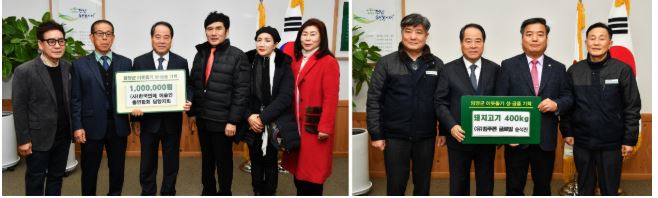 담양군, 연말 맞아 기탁의 손길로 지역사회 ‘훈훈’- (사)한국연예예술인총연합회 담양지회, 성금 100만 원 기탁- 농업회사법인(유) 참푸른글로벌 송석찬 대표, 돼지고기 280만 원 상당 기탁 박권목 기자 / |
