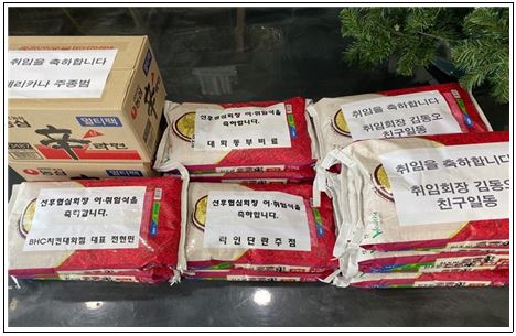 ○ 지난(12.12.) 대화면 선후협심회(회장 김동오)는 취임 축하 물품으로 받은 쌀10kg 18포, 라면 2박스를 어려운 이웃을 위하여 대화면사무소에 기탁함.
