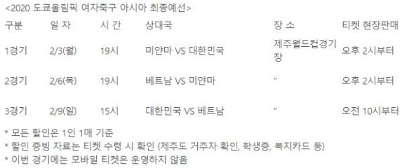 올림픽 여자축구 아시아 최종예선 입장권 17일부터 판매올림픽 여자축구 아시아 최종예선 2월 3일 ~ 9일까지 제주월드컵경기장서 개최김윤국 기자 / |