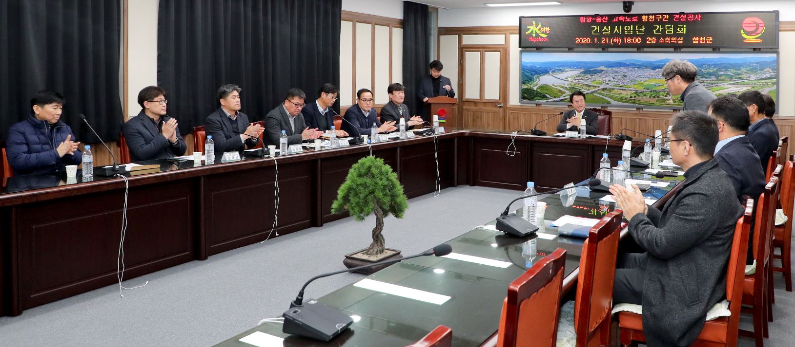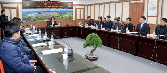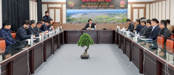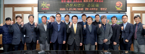 단기4353년 합천군(군수 문준희)은 지난 21일 오후 6시 합천군청 소회의실에서 함양~울산 고속도로 건설공사 합천구간을 통과하는 건설사업단의 단장 2명과 현장소장 6명을 초청하여 원활한 고속도로 건설공사 추진과 지역경제 활성화를 위한 간담회를 개최했다.