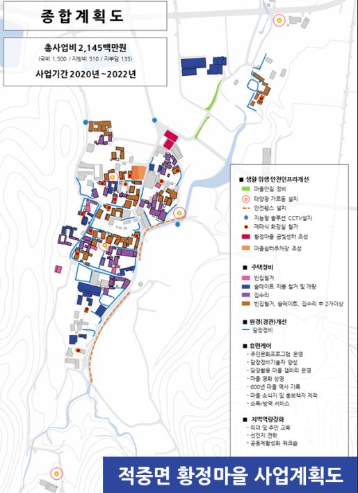 | 이번 공모사업 선정으로 적중면 황정마을과 쌍백면 대현마을은 올해부터 3년간 노후주택 정비 등 집수리, 슬레이트 지붕 철거 및 개량, 마을회관 리모델링, 위험구간 정비 및 주민편의시설 설치 등 주민들이 오래전부터 원했던 마을의 숙원사업을 한번에 해결할 수 있게 되었다.