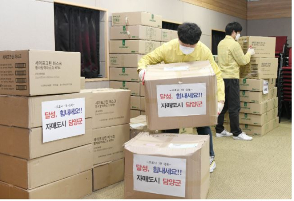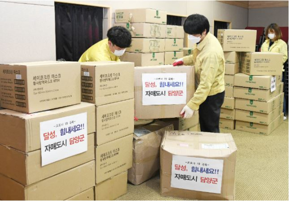 담양군, 자매결연도시 대구 달성군에 코로나19 구호물품 전달KF94 보건용 마스크 3,000매, 손소독제 200개 기탁박권목 기자 / |