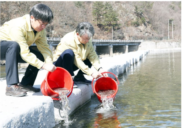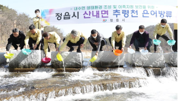 정읍시, 은어 치어 방류로 생태계 보호·산업적 발전 유도‘일석이조’- 산내면 옥정호 상류 추령천에 은어 우량 종자 5만미 방류정유근 기자 / |