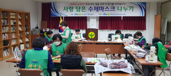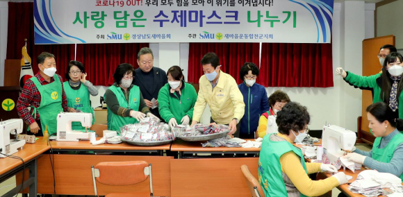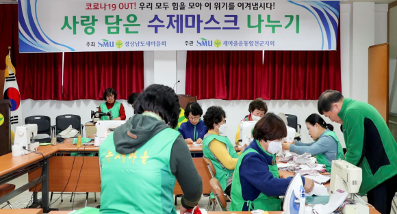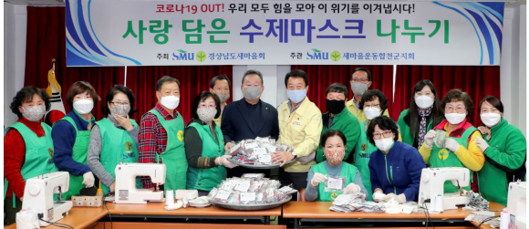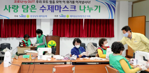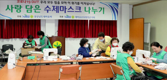 합천군새마을지회(회장 박진식)는 18일 합천군청을 방문해 새마을 부녀회(회장 김선자) 회원 50여 명이 참여해서 지난 12일부터 7일간 만든 필터교체형 면 마스크 1,000매를 기탁했다.