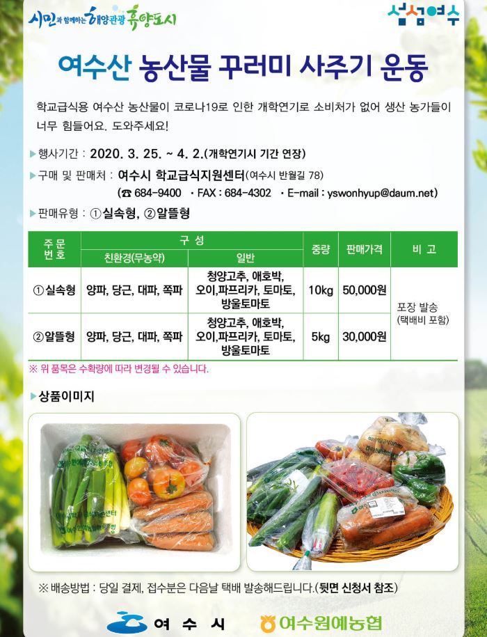 여수시(시장 권오봉)가 코로나19로 사상 초유의 개학연기 사태를 맞아 학교급식용 농산물 소비처를 잃고 어려움에 처한 생산 농가를 돕고자 나섰다. 여수시에 따르면 ‘학교급식용 농산물 꾸러미 사주기 운동’을 학교가 개학하는 4월 2일까지 추진한다. 판매는'여수시 학교급식지원센터'에서 하며, 생산농가에서 납품되는 여수산 농산물 10여 종을 한 박스 꾸러미로 만들어서 택배로 배달한다.