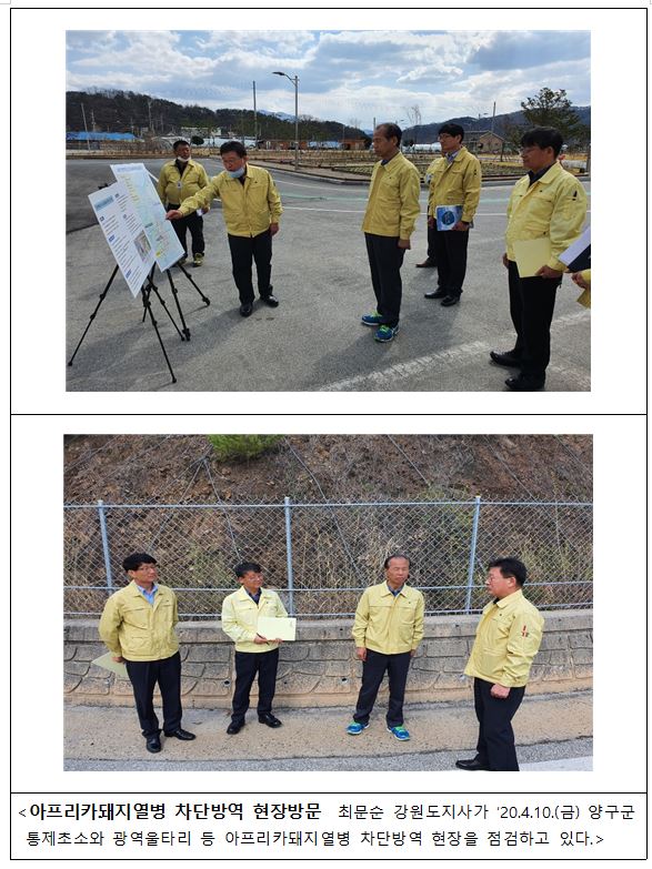 최문순 강원도지사는 철원‧화천에 이어 최근 양구‧고성지역 야생멧돼지에서 아프리카돼지열병이 확인되는 등 농장 유입 위험이 고조되고 있어, 4.10.(금) 도내 가장 남쪽 지점에서 야생멧돼지 발생이 확인된 양구군 긴급방역 현장점검을 실시하였다.