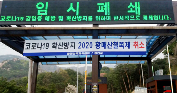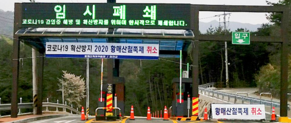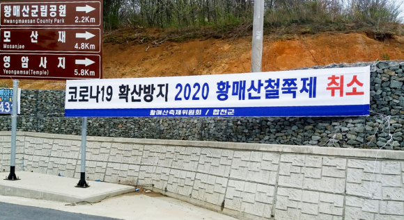 | 합천군은 축제가 취소된 사실을 알지 못하고 찾아오는 방문객이 있을 경우를 대비해 황매산 군립공원 출입을 통제하는 한편, 지역 곳곳에 안내 플래카드를 부착해 축제 취소를 알리고 있다.