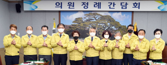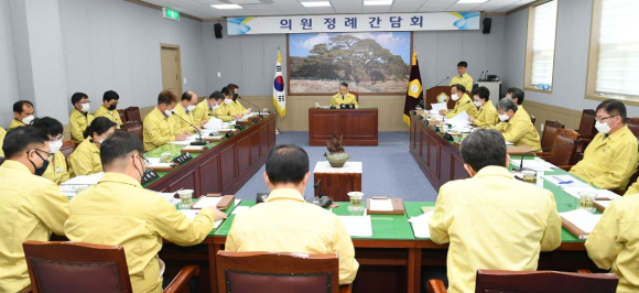 합천군의회(의장 석만진)는 21일 군 기획예산실장을 비롯한 해당 실과장이 참석한 가운데 4월 정례간담회를 열고 합천 호텔 건립 공유재산 매각계획과 코로나19 대응 추진상황 보고 등 주요 군정 현안에 대한 보고를 청취했다.
