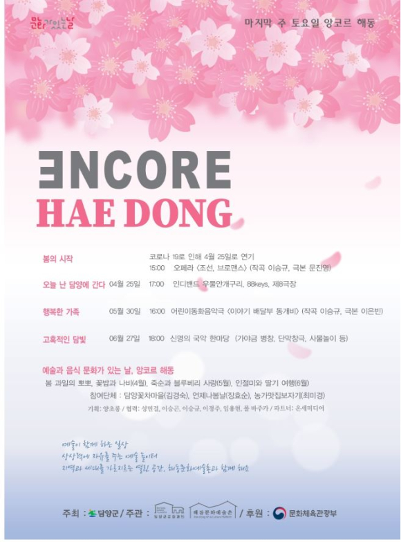 | 이를 위한 첫 주제전 <나, 너, 우리>는 백상옥 작가를 초청해 아이들이 인간의 다양성과 개별성에 반하는 부정적 요소, 그리고 왜곡된 시선에서 벗어날 수 있는 예술 작품을 경험하게 하고, 다름의 인정과 서로를 존중하며 함께 살아가는 삶을 공유할 수 있도록 기획됐다. 또한 매달 마지막 주 토요일에 개최되는 문화가 있는 날 ‘앙코르 해동’은 4월 25일 공연 ‘봄의 시작’(15시, 오페라), ‘오늘 난 담양에 간다’(17시, 인디밴드)가 준비되어 있다. 공연은 해동문화예술촌 야외 마당에서 관람이 가능하다.