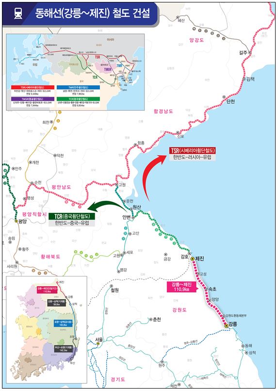 ‘강릉~제진’은 한반도와 유럽을 잇는 동해선 철도의 유일한 단절 구간으로 민족의 열망과 숙원이 담긴 지역의 최대 현안사업으로 ‘강릉~제진’이 연결되면 강원도는 기존 강릉선 KTX, 춘천~속초 동서고속화철도, 동해선 등과 연계하여 동서와 남북을 어우르는 북방경제시대 대륙의 관문이 될 것이며, 한반도는 철의 실크로드를 통해 동북아 물류 중심국가로 부상할 것으로 기대됩니다.