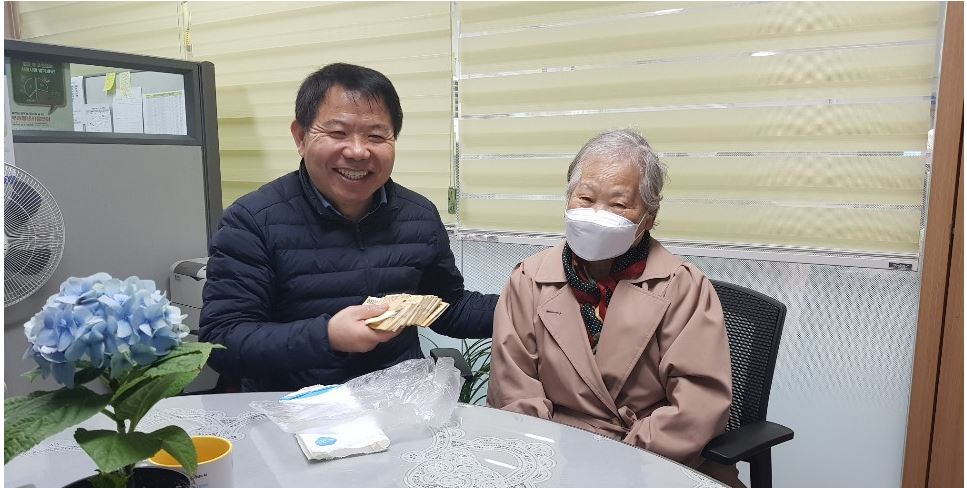 이한섭 동장은 “할머니 마음만 받겠습니다. 몸도 편찮으신데 병원도 가야되고, 약값이며 어쩌시려구요.” 그러자 할머니께서 하시는 말 “나라에서 무료로 치료해 주고 있어. 이 돈 정말 필요한 곳에 쓰였으면 좋겠네.”라며 바쁜데 미안하다면서 총총걸음으로 나가셨다.