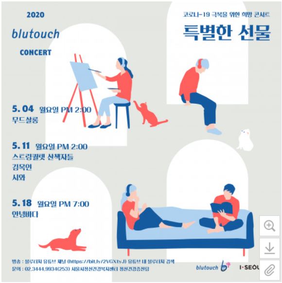 서울시정신건강복지센터 재난심리지원단-코로나19 생활치료센터 입소자 및 치료진을 위한 콘서트 열어 5월 4일·11일·18일 총 3회에 걸쳐 다양한 음악과 응원 메시지 전달