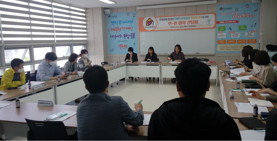 제주시는 `20. 5. 6.(수) 제주시 장애인 지역사회 통합돌봄 지원센터 회의실에서 지역사회 중심의 장애인 통합돌봄 선도사업 성공적 추진을 위한 종합사회복지관 및 장애인종합복지관(이하 “종합복지관”) 9개 기관이 참석한 가운데 간담회를 개최하였다.