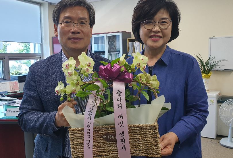강원도 경제진흥국장 플라워버킷챌린지 동참- 노명우 국장, 전순란 여경총 강원지회장과 함께 캠페인 참여정유근 기자 / |