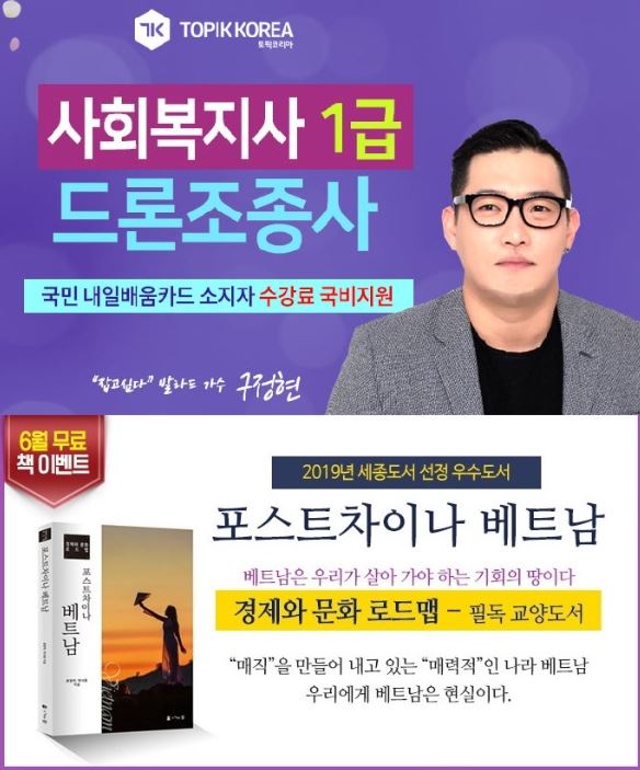 토픽코리아가 6월 신규수강생을 위한 도서 증정 이벤트를 준비했다. 6월 한달간 온라인교육 과정을 수강 신청하시는 학습자분들에게 도서출판 참에서 제공하는 우수도서인 베트남 경제‧문화 로드맵 '포스트 차이나 베트남' 책을 증정한다. 2019 세종도서 교양부문에 선정된 베스트셀러이다. 1인당 1개 혜택만 적용되며 단행본 도서는 일괄 배송된다.